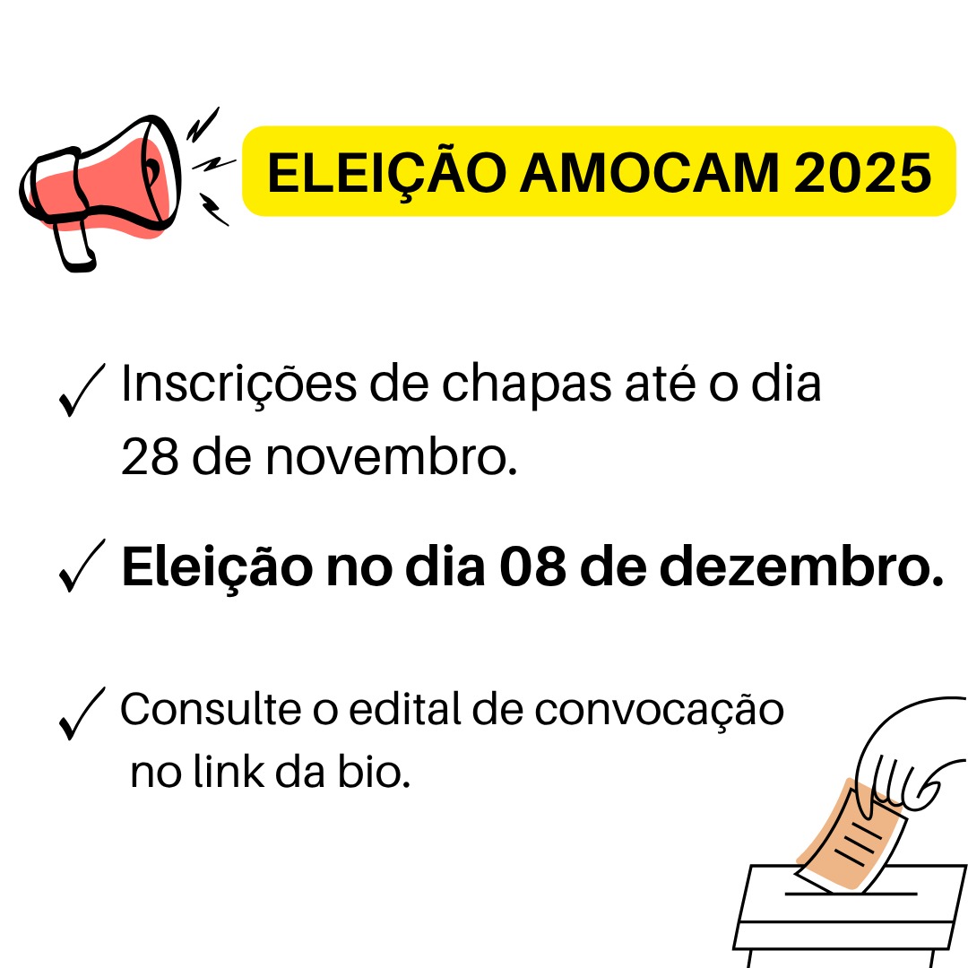 A Comissão Eleitoral da associação informa que as chapas interessadas em concorrer ao pleito comunitário devem consultar edital de ‘convocação de eleições’, no link https://acesse.one/9wfE0. As inscrições, por sua vez, devem ser feitas por email (eleicaoamocam2025@gmail.com) impreterivelmente até 28/11, para se habilitar à eleição.