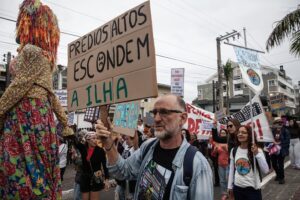 FOTO-LEGENDA: Protesto no Campeche alerta para danos ambientais da verticalização desenfreada que castiga o Sul da Ilha